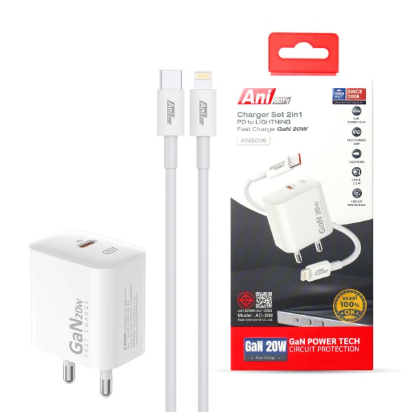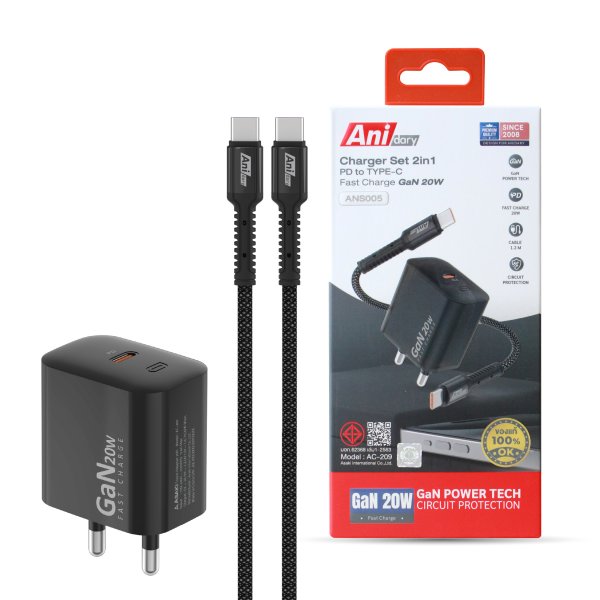 ANS005 : Charger Type-C fast charger PD20W + Cable Type-C to Type-C fast charger 3A/60W (Nylon)